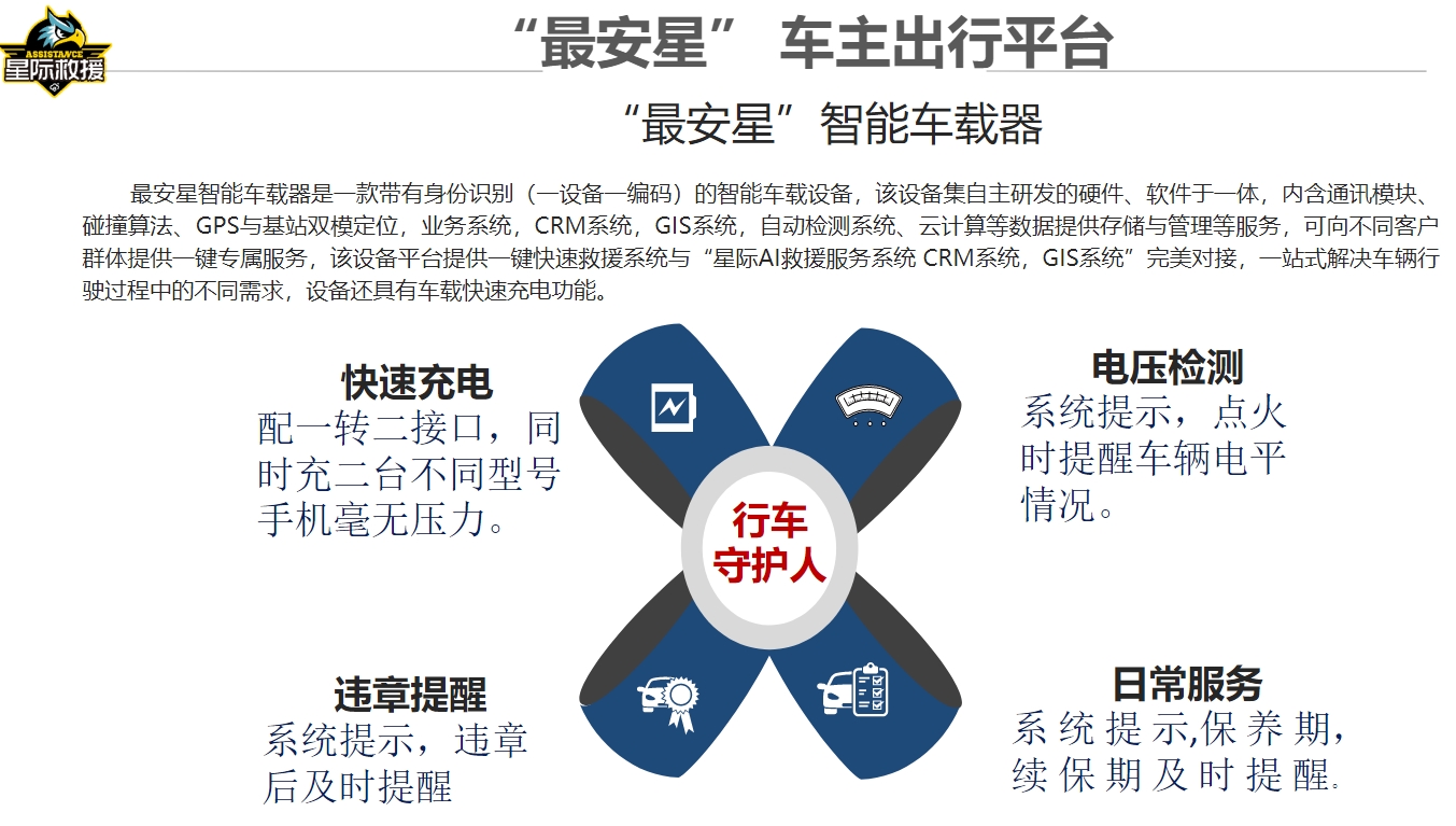 ● 构建遍布全国的 “汽车救援平台”以及 “最安星车主出行平台”。打造全国的“生态救援链”,优化救援供给结构,赋能行业降本增效。
